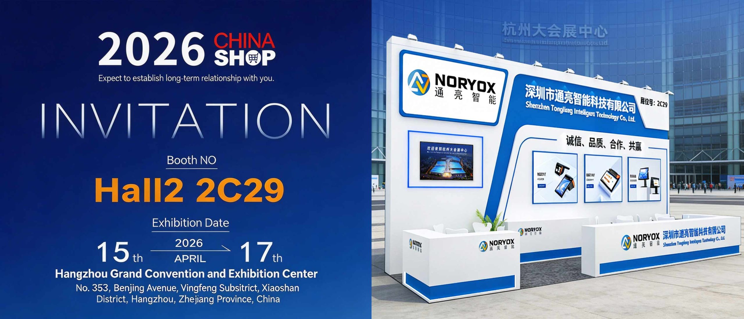 From April 15 to 17, 2026, 2026 CHINASHOP will be grandly held at Hangzhou Grand Exhibition Center. Shenzhen NORYOX Intelligent Technology Co., Ltd. will make a distinguished appearance under the theme “Intelligent Connected Terminals Empower the Future of Retail” with a 27㎡ professional booth (Hall 2, Booth 2C29). The company will showcase its full range of POS terminals, commercial tablets/KDS display devices, and ODM customization achievements in AI and biometric recognition, discussing new trends in retail intelligent terminals with global industry partners.