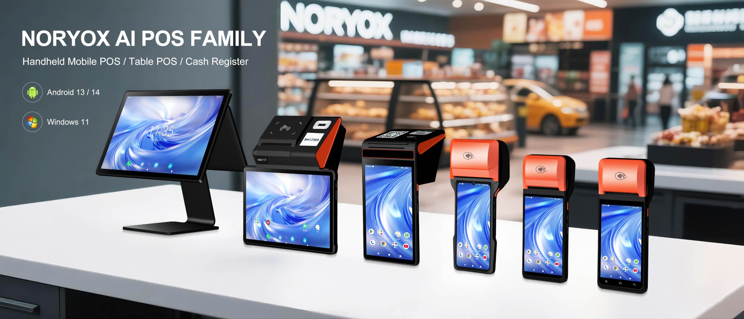 Centered on hardware compatibility and scenario adaptability, the NORYOX AI POS Family is equipped with mainstream operating systems such as Android 13 (A13), Android 14 (A14), and Windows 11, providing a flexible foundation for B-end customers to integrate AI software. The specific product matrix and scenario values are as follows:
